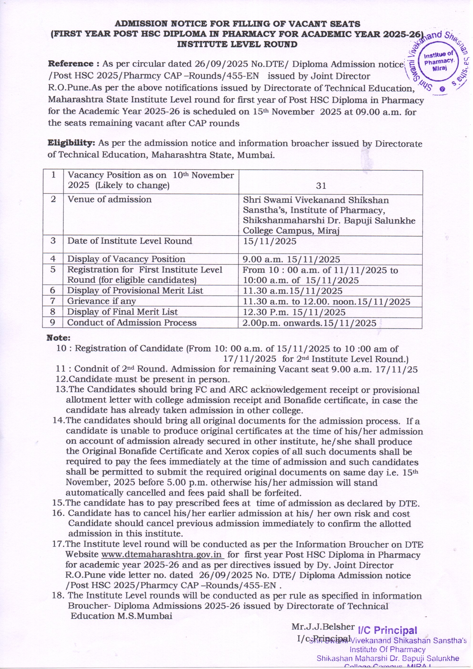 Institute Level Round Admission Notice 2025-26