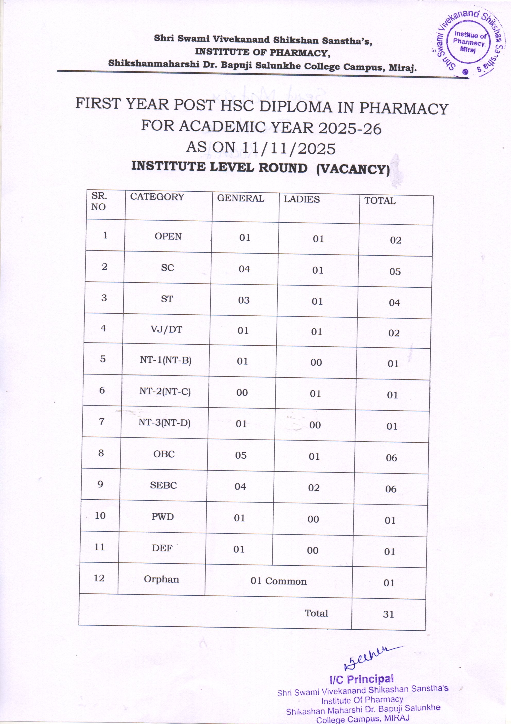 Institute Level Round - Post HSC 1st Year D. Pharm.