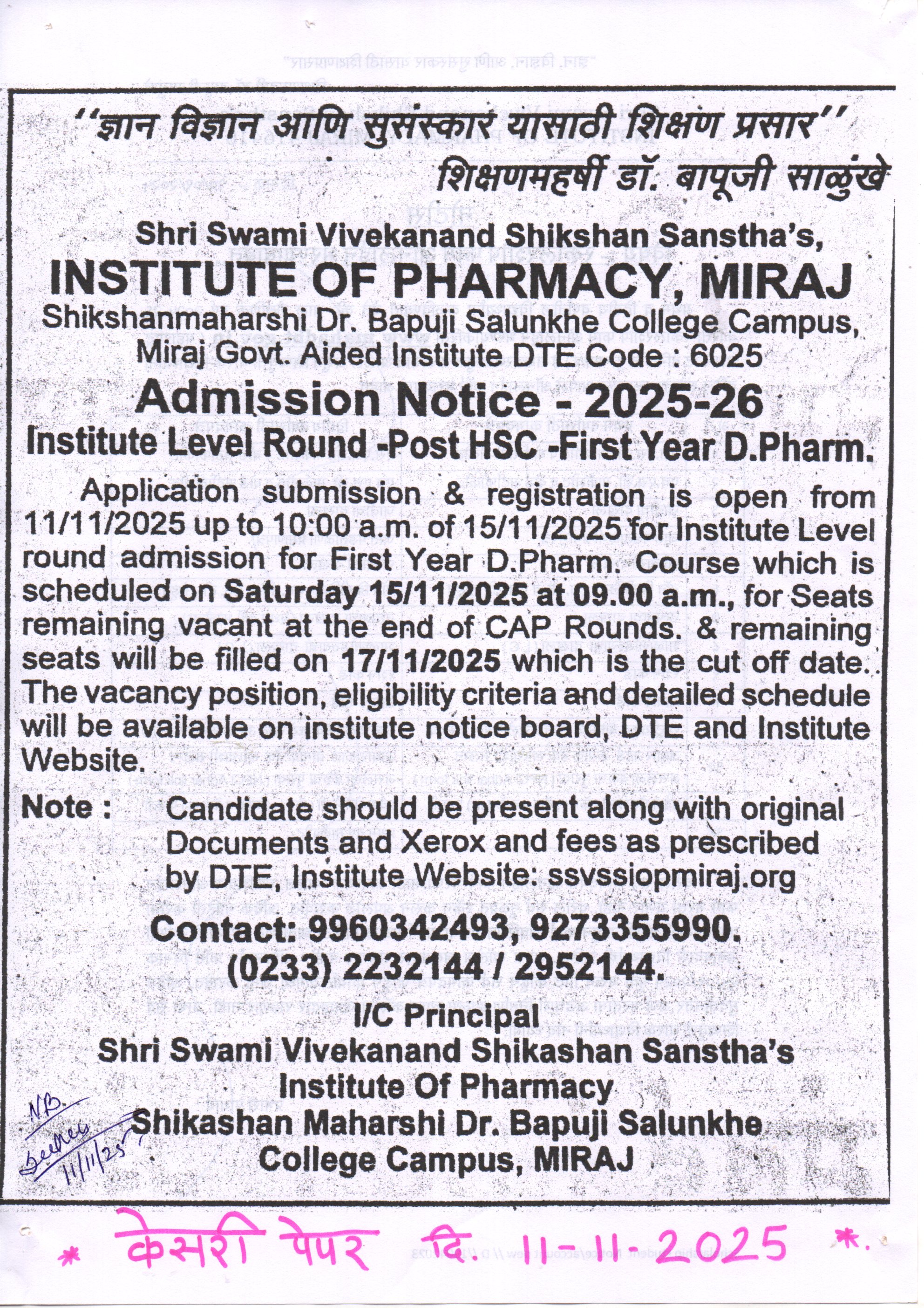 Kesari Paper News 11-11-2025 Admission Institute Level